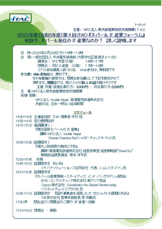 TAI株式会社(東京都新宿区、代表:シャラド・ライ)は、2024年2月29日ネパールのIT産業における最新の動向や展望を共有するため、第4回『ネパールIT産業フォーラム』において当社代表のシャラドと営業本部部長の原が登壇いたします。登壇者プロフィール:シャラド(代表)は、東京大学で学士号を取得し、現在は博士課程に在籍しています。以前はソフトバンク株式会社の新規事業推進室に所属していました。ネパールでは、TAI株式会社の経営だけでなく、他の複数の企業や学校の経営も行っています。原(営業本部部長)は、大学在学中からWEB業界に携わり、スタートアップからプライム企業まで、さまざまな会社のプロダクト開発やITプロジェクトの支援の経験があります。また、様々な国籍のエンジニアや企業との開発実績も持っています。